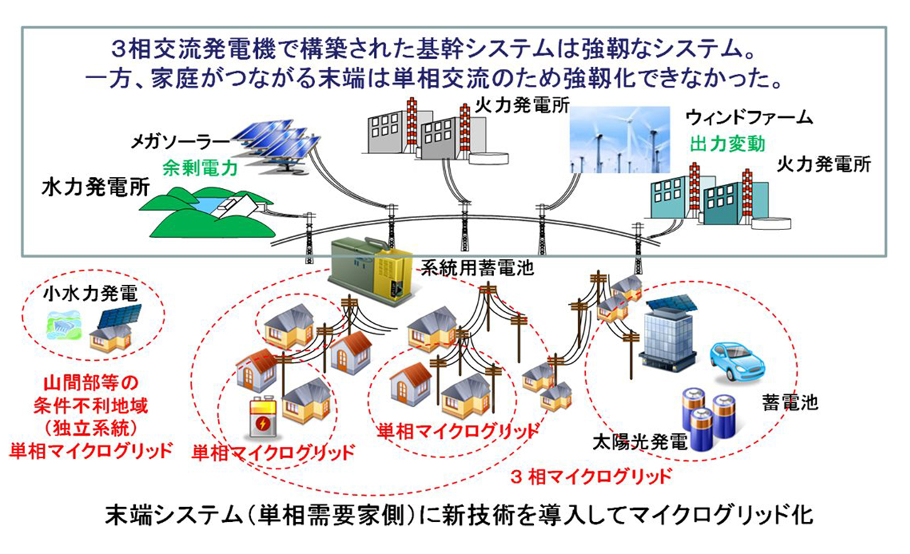 一般家庭は単相交流の配電線に接続されており、ここに大量の再エネを導入して一般需要家を強靱化しながら、カーボンニュートラルを実現するという他にはないアプローチです。