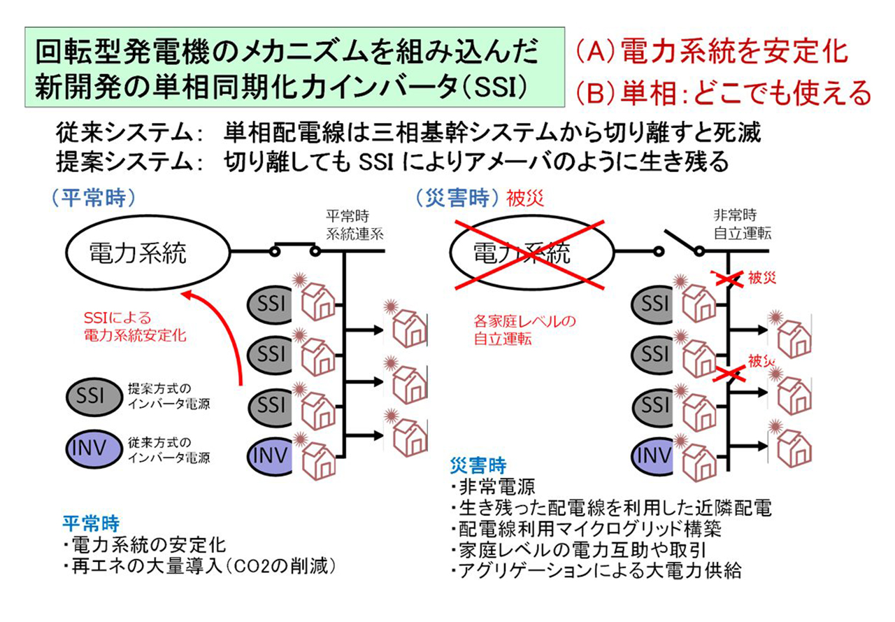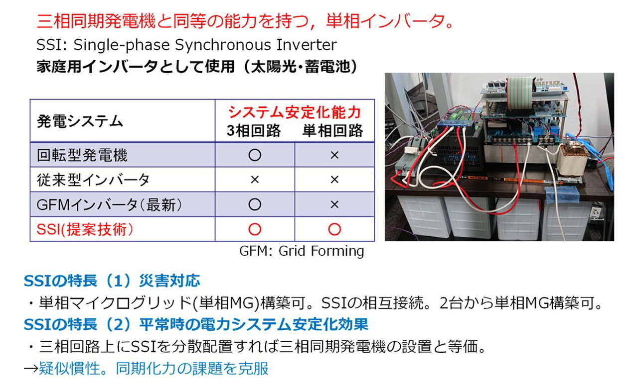 これは、太陽光発電や蓄電池などの独立した単相交流電源を、基幹電力システムの従来型発電機のように相互に自由にかつ安定に接続する新技術で、これまでに存在しなかった「単相交流」で「自立型マイクログリッド」を構築できる道筋を示しました。