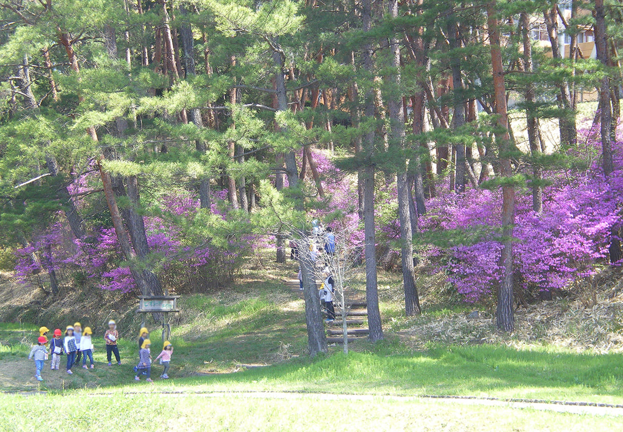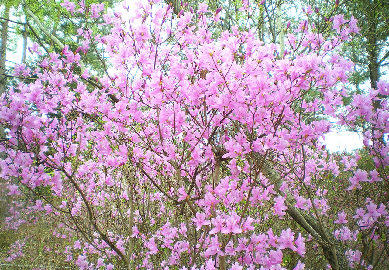 その一方で、工学部西斜面のアカマツ林は、移転してきてから今まで、施設部により下草刈りが実施されてきました。手入れのされたアカマツ林は、ほかの場所に比べて松枯れも少なく、樹林下では、毎年みごとにコバノミツバツツジが咲き誇っています。