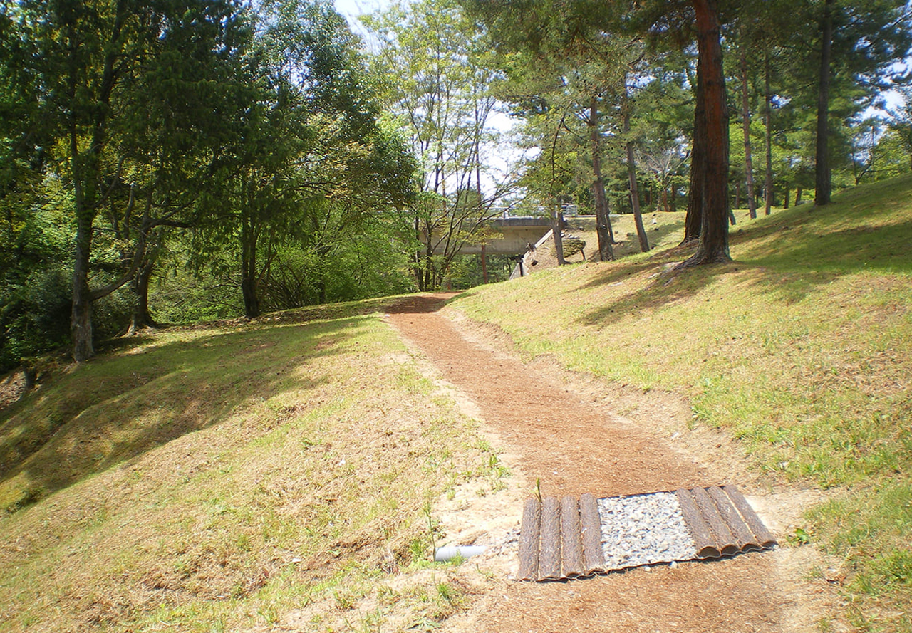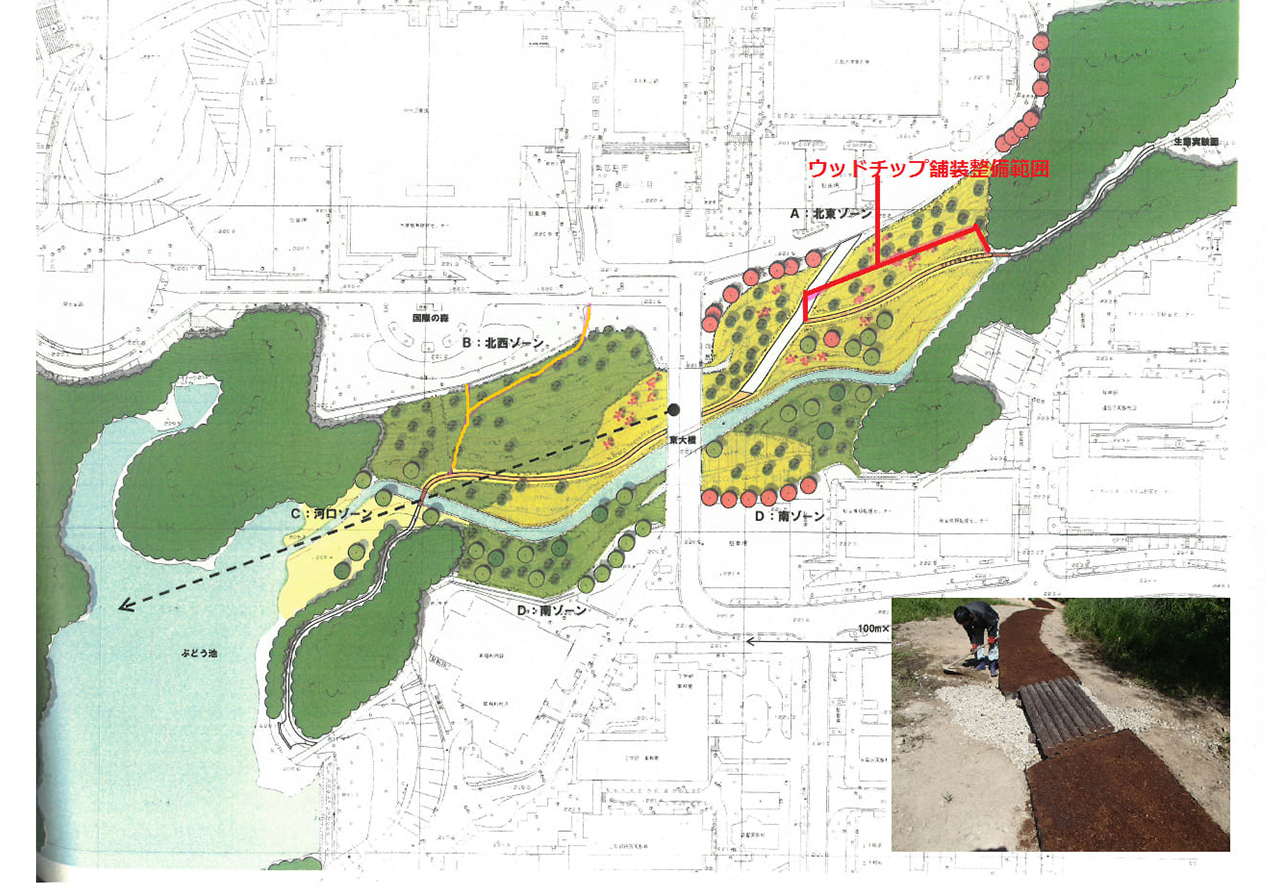 2017年、施設部により東大橋周辺の整備計画が立てられ、下草刈りなどの作業が行われました。発見の小径の観察路として利用されていた道は、これまでは、下草が茂りぬかるんで歩きにくかったのですが、ウッドチップ舗装が施され、非常に快適で歩きやすい空間に生まれ変わりました。