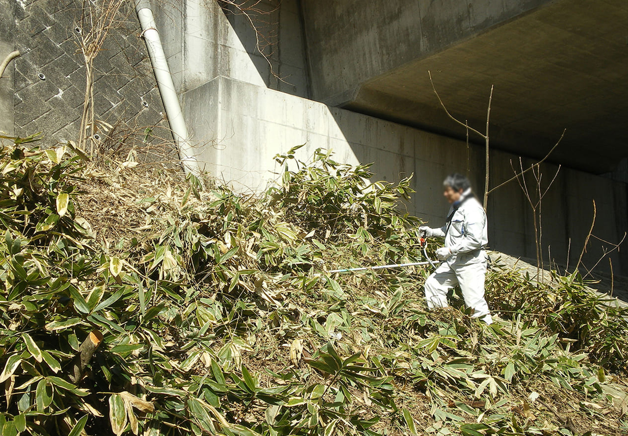 キャンパスの中はと言うと、東大橋周辺は、造成工事のために樹木が伐採され斜面は土砂により塗り固められました。その後、手入れがされることもなく放置された斜面ではササ類が繁茂し、クズなどのつる植物やセイタカアワダチソウなどの帰化植物で覆われ、荒廃した環境になっていきました。キャンパスでは、松枯れにより毎年多くのアカマツが伐採されています。東大橋周辺でもそれは同じです。このままいくと周辺のアカマツはすべてなくなってしまうでしょう。