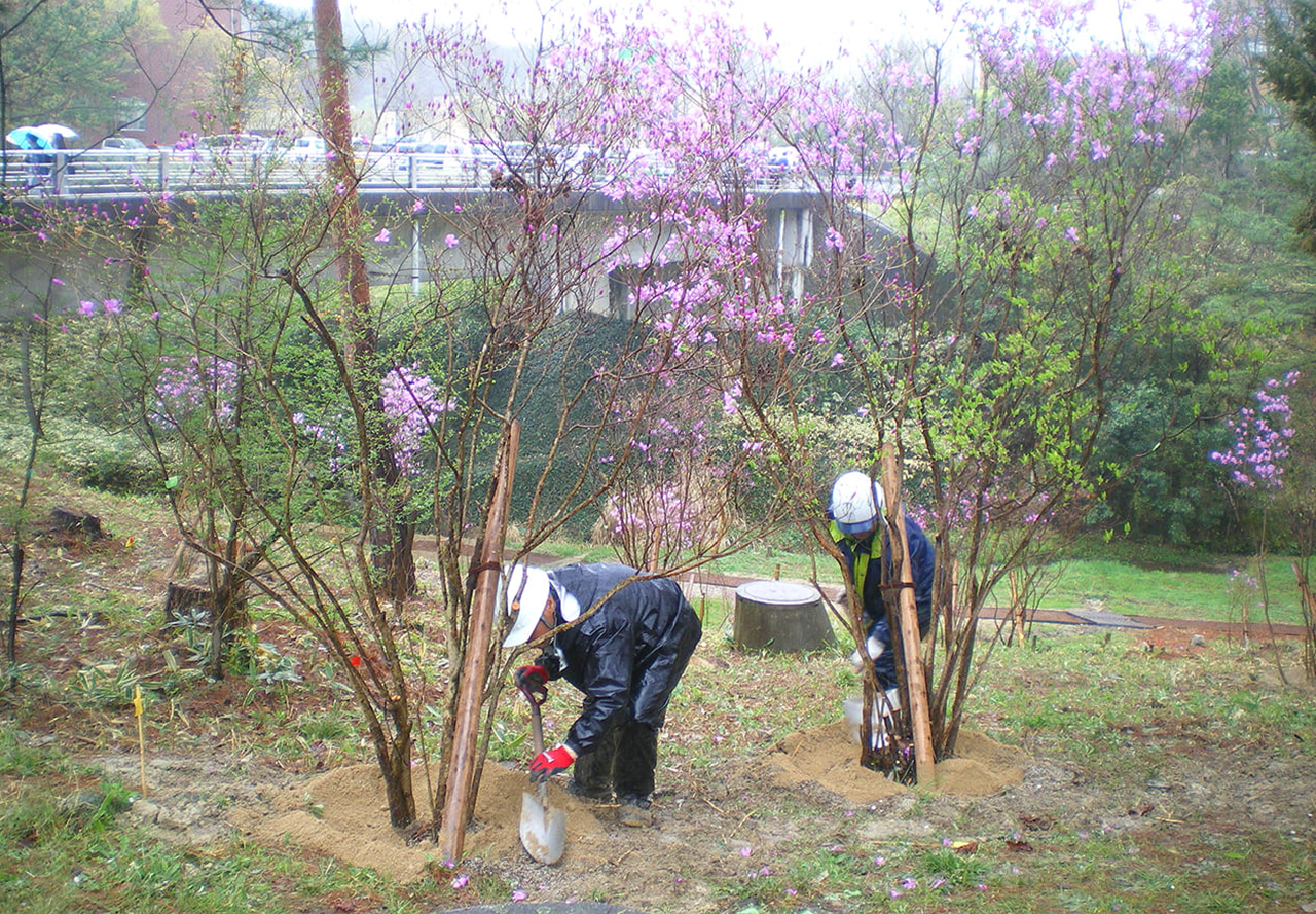 そこで、1995年に放射光科学研究施設建設の際に、ががら山より移植し、東広島植物園にて蘇生・保護を行っていたコバノミツバツツジの苗木30本を東大橋周辺の斜面に植栽し、再生を試みました。