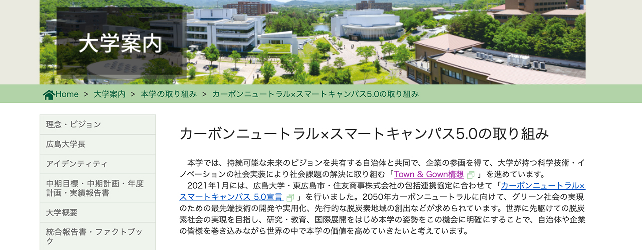 - 広島大学は2030年までに、高規格5Gネットワーク網を基盤としたSociety5.0を実装したスマートキャンパス5.0を実現します。