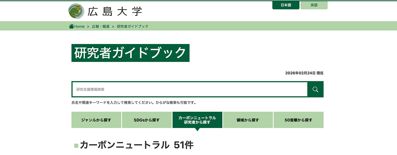 研究者ガイドブックでカーボンニュートラルに関連する研究を行っている研究者を検索できます。