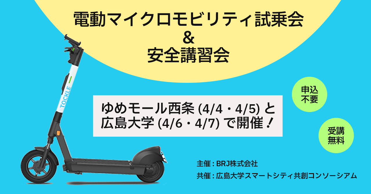 2026年4月4日(土)〜7日(火) 電動マイクロモビリティ試乗会&安全講習会【ご参加ありがとうございました】電動マイクロモビリティをより安全にご利用いただくため、ゆめモール西条および広島大学で、試乗会と安全講習会を開催します。