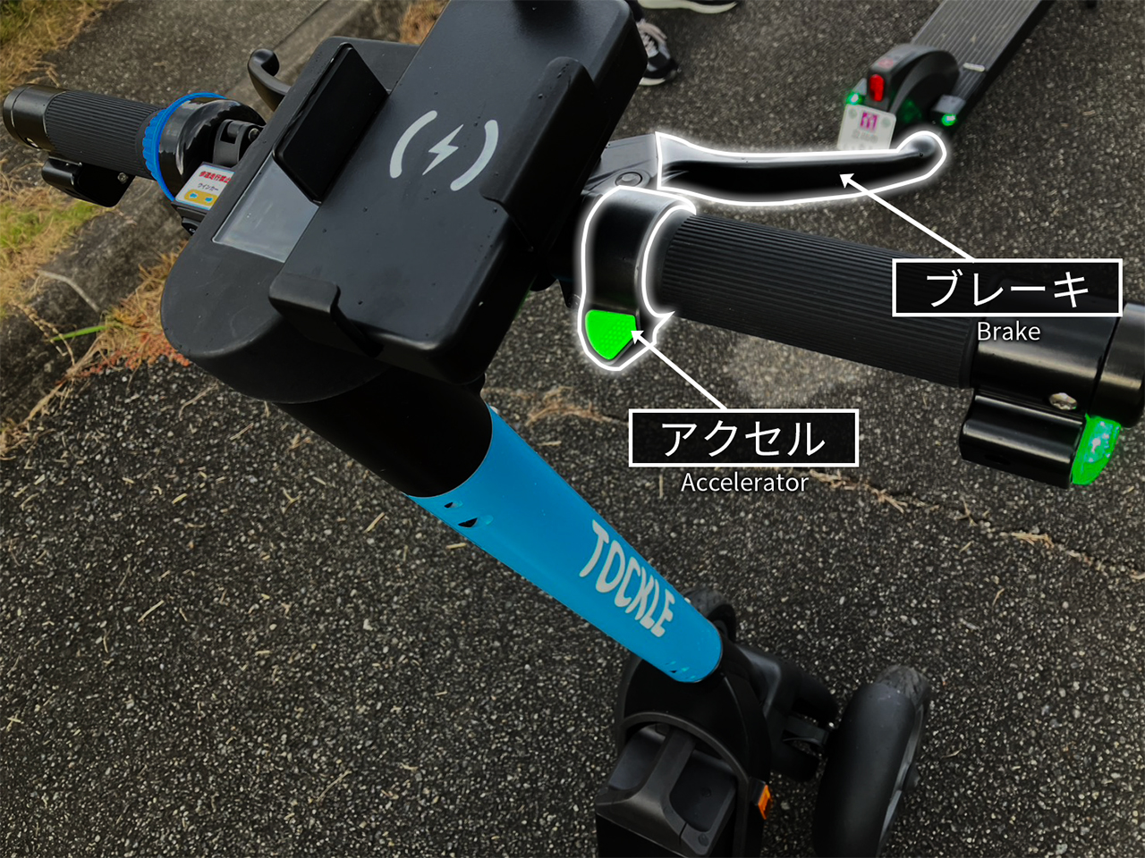 どちらの型も、ハンドル部分のアクセルを親指で押すことで加速し、自転車のようにブレーキレバーを握ることでブレーキがかかります。