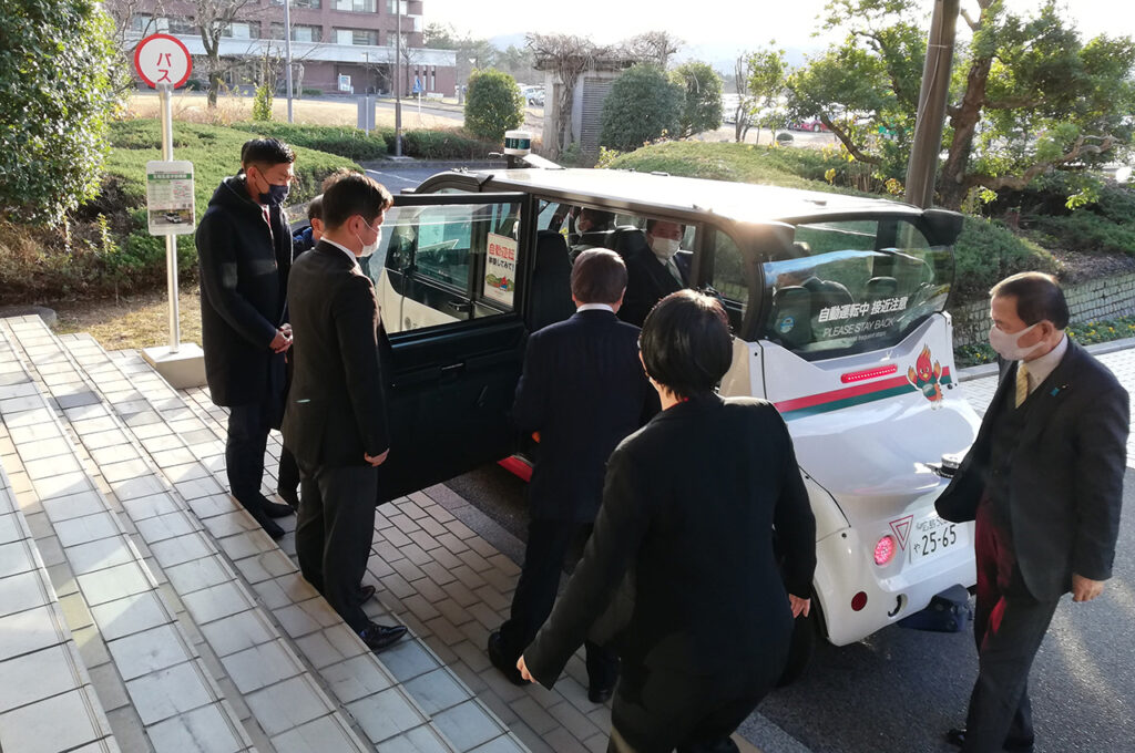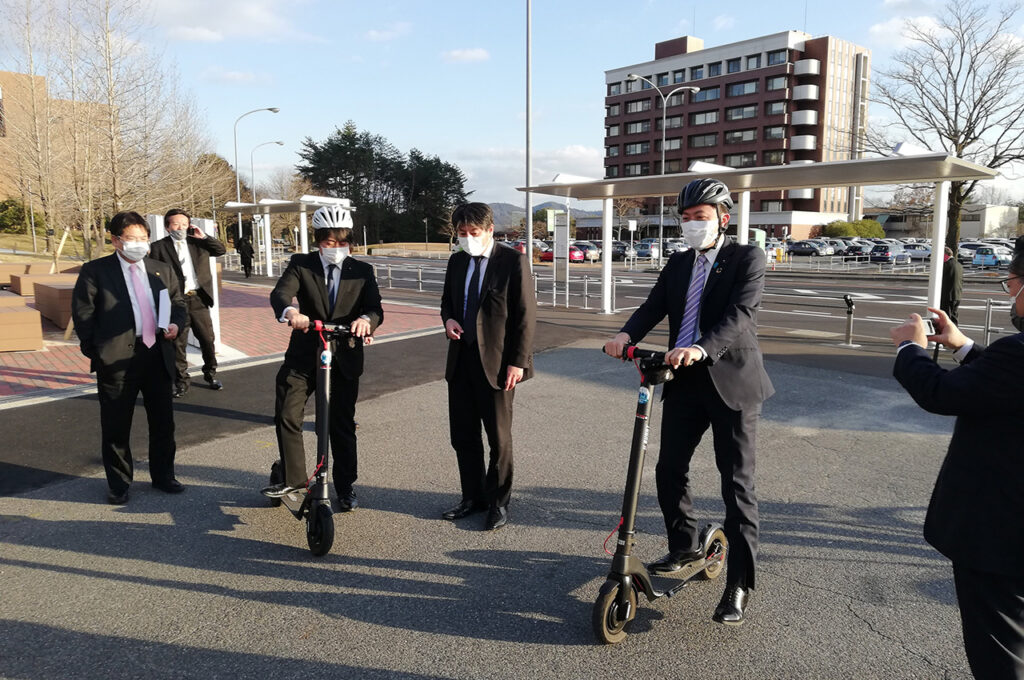 TGOから本学のカーボンニュートラルに向けた体制や活動内容について説明し意見交換を行うとともに、カーボンニュートラルにつながる実証実験として取り組んでいる、電動キックボードや自動運転シャトルHIROMOBIなどの新たなモビリティに試乗いただきました。