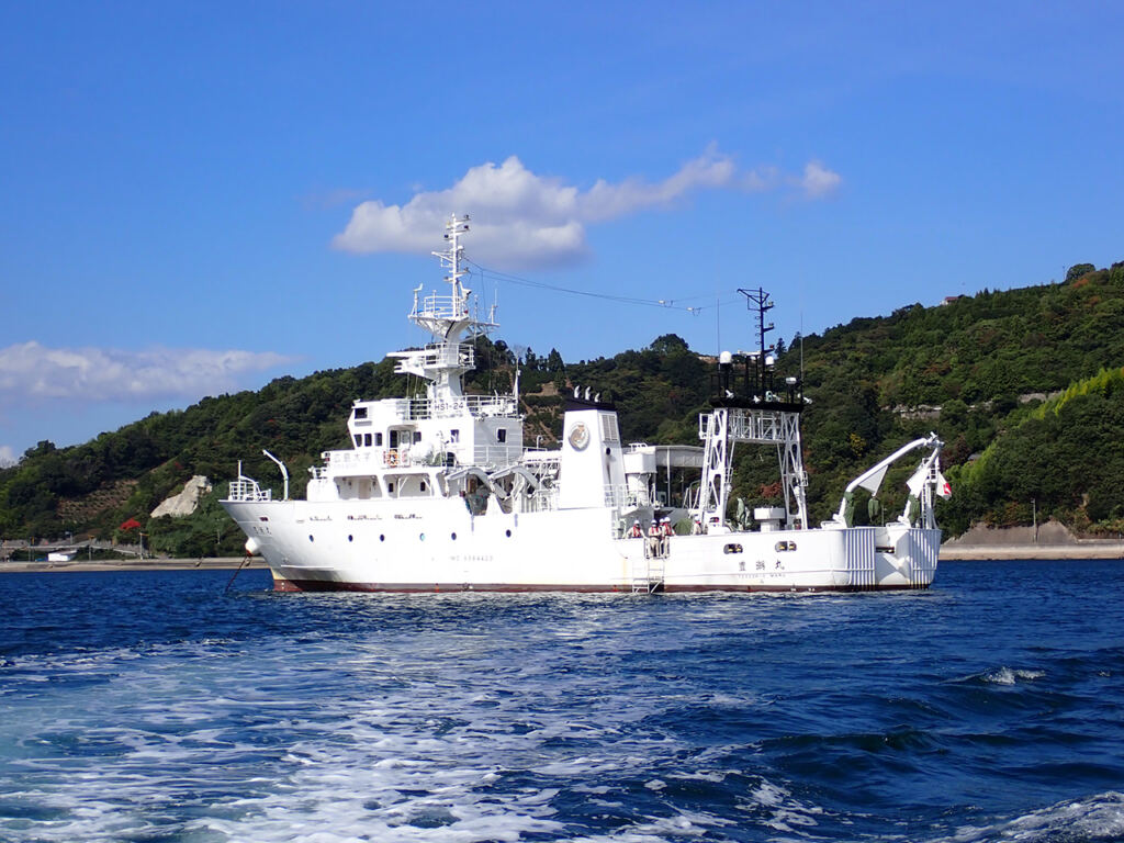 本学生物生産学部には教育・研究の拠点となる練習船「豊潮丸」が所属しています。中国・四国地方の国立大学附属の中型練習調査船は本船のみで、学内外の学生や研究者に広くご利用いただいております。さらに本船では海や船への関心を持つきっかけとなるよう、周辺の小中高生や一般の方向けの体験航海にも力を入れています。