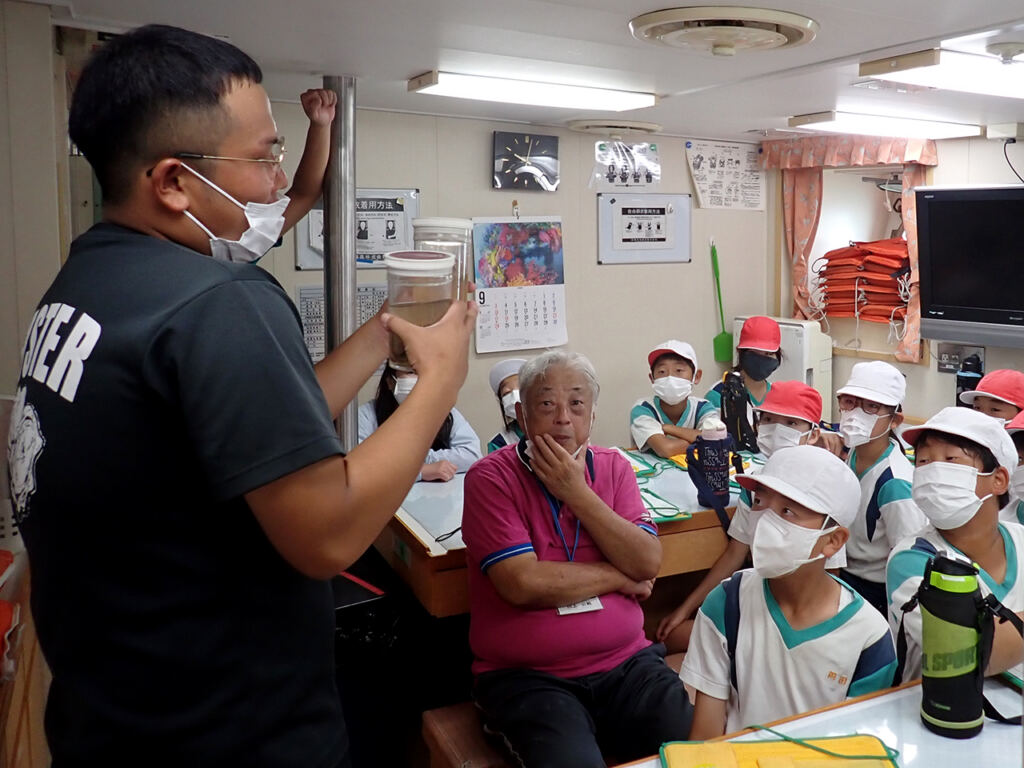 2023年9月19日(火)に東広島市立木谷小学校の体験航海を行いました。小学5~6年生の児童17名と教員3名、地元のカキ養殖業者2名、東広島市議会議員1名の合計23名が乗船しました。船内見学では船の操縦やエンジンについて学び、観測体験では採集したプランクトンを顕微鏡で観察しながら海の生態系や地域の特産品カキとプランクトンの関係について理解を深めました。児童らは船の設備や仕組みについて質問したり,熱心にプランクトンを観察したりと、積極的に学び、充実した時間を過ごしたようです。