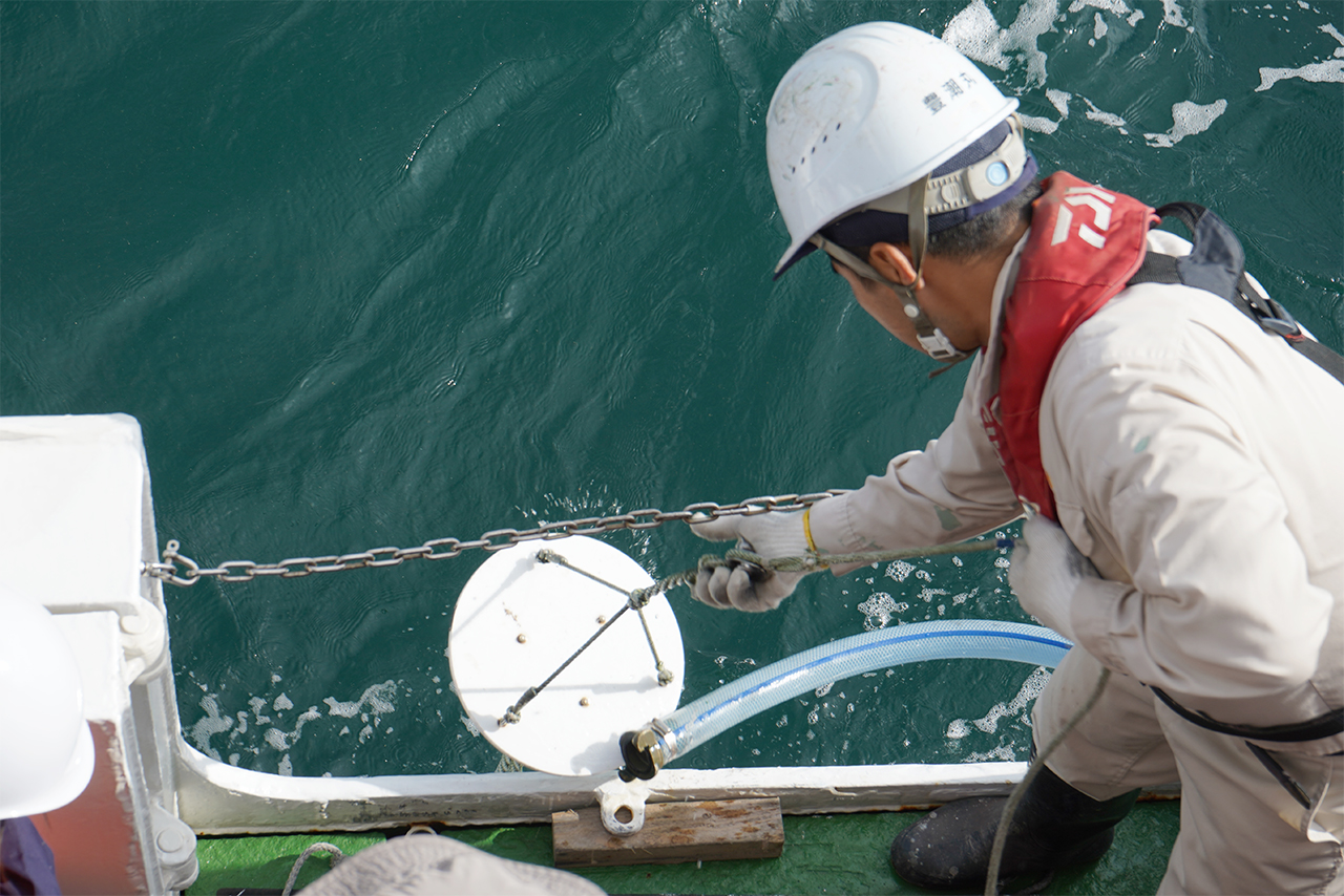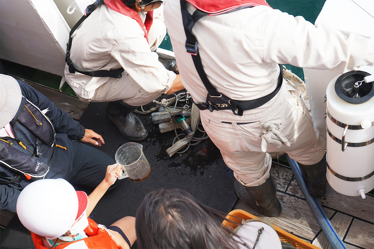 直径30cm程度の細かい網目のネットを小型のクレーンで海深20mまで沈めます。少し時間をおいて引き上げると、茶色く濁った海水が網の底に溜まっていました。この海水に含まれた茶色い物質がプランクトンです。